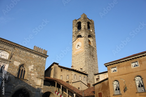 Bergamo - Old city (Città Alta). Landscape on the the ancient Administration Headquarter called Palazzo della Ragione and the clock tower called Il Campanone