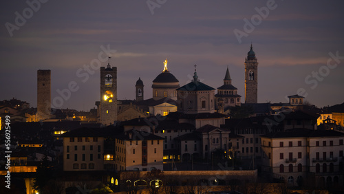 Bergamo. One of the beautiful city in Italy. Landscape at the old town from the hill at evening. Amazing view of the towers, bell towers and main churches. Touristic destination. Best of Italy
