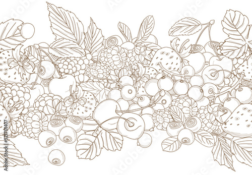 Berries mix seamless border frame of cherry, currant, blueberry,