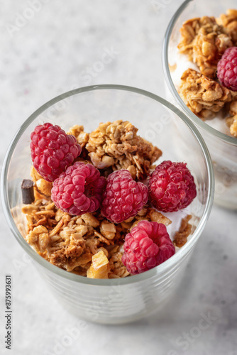 Berry dessert in glass with granola, fresh raspberries, yogurt or cream cheese. Healthy breakfasr concept, vegetarian on gray background close up