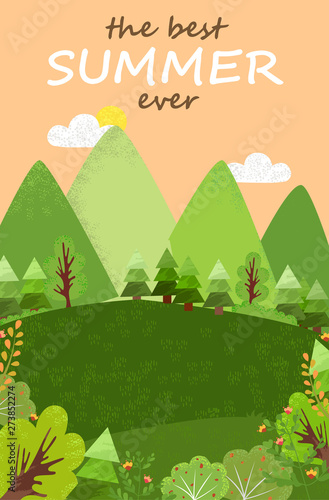 Best summer ever landscape, green forest and field, trees and bushes, firs and pines. Fresh greenery, flowers and sun, summertime forever background