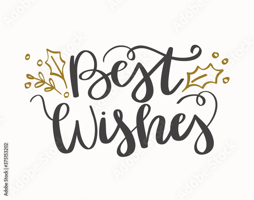 Best Wishes hand drawn lettering with branches and holly leaves. Handwritten Christmas calligraphy. Winter holidays greeting card design, gifts.