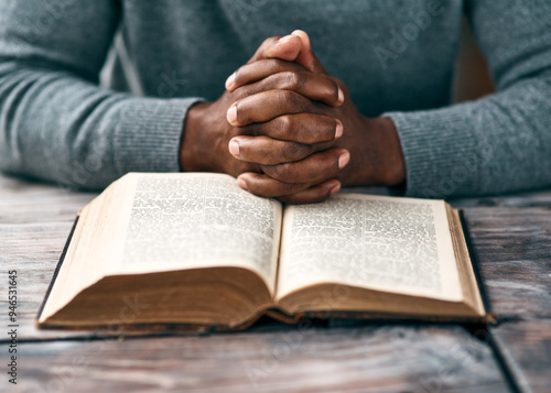 Bible, hands and Christian person reading book in spiritual religion for peace, guidance and learning. Closeup, education or worship with praise, scripture and gratitude with prayer, faith and gospel