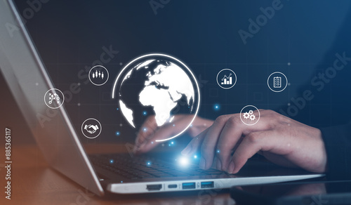 Big data and analytics visualization technology with scientist analyzing information structure on virtual screen,iot, finance, machine learning to extract predictions for business.