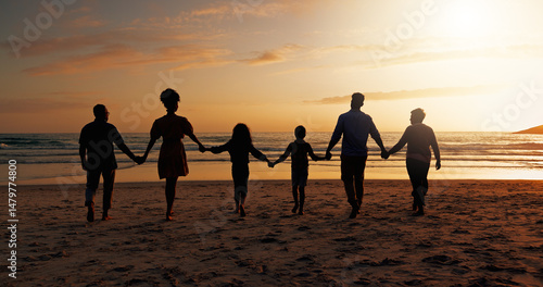 Big family, sunset and holding hands with kids on beach of summer holiday, travel and bonding together. Space, back and view of people for ocean journey of getaway, tropical vacation and relationship