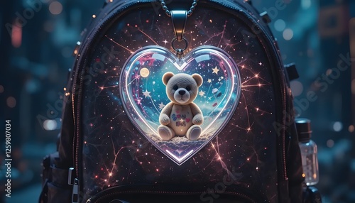 big glass transparent heart pendant on backpack filled with neon contoured cartoon space, stars and tiny teddy bear inside
