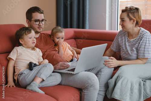 Big happy family watching movies playing games on laptop. Mother father kids spending time with gadgets on sofa Children with parents looking on computer screen at home Siblings playing with console