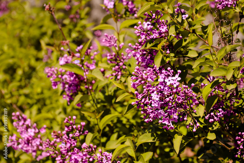Big lilac branch bloom. Bright blooms of spring lilacs bush. Spring purple lilac flowers close-up on blurred background. Bouquet of purple flowers