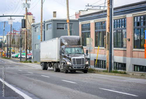 Big rig dark brown day cab semi truck transporting cargo in short dry van semi trailer running on the urban city street