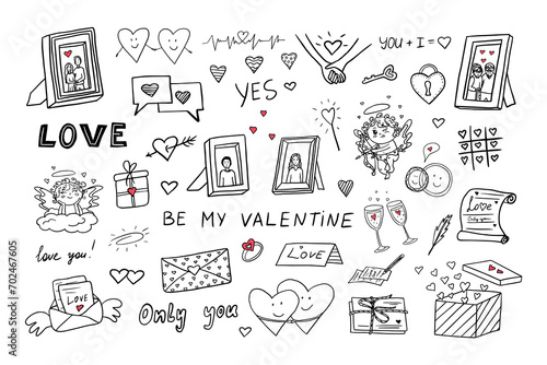 Big set doodle vector elements with hearts, love letters, envelopes with heart icons, frames photos, cupids for valentine's day cards, wedding day, posters, wrapping and design. Love story