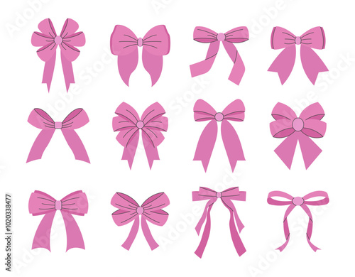 Big set pink bows and gift ribbons. Bow knots for gift wrapping.