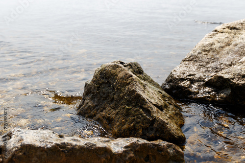 Big stones lie on sea beach. Coast. Nature background. Water with waves. Seascape