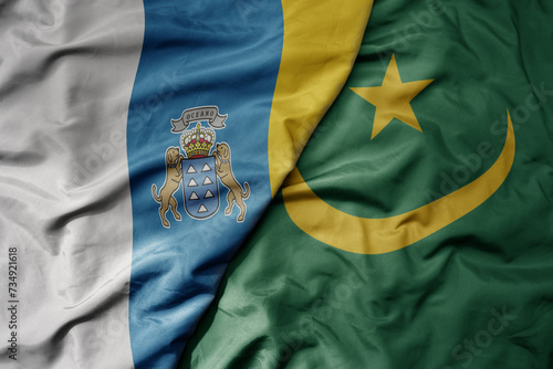 big waving national colorful flag of mauritania and national flag of canary islands .