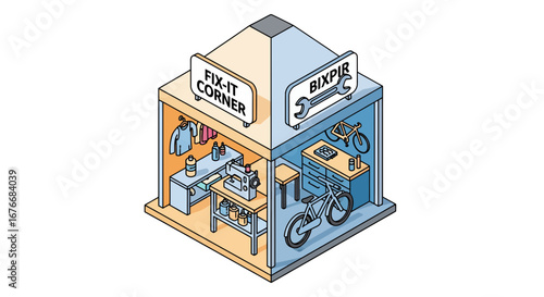 Bike repair shop interior isometric view