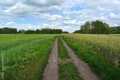 bike standing on the side of the long dusty road near a large green field of ripening wheat in the summer