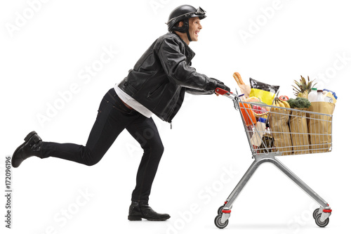 Biker pushing a shopping cart filled with groceries