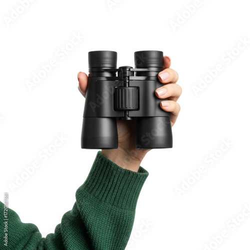 Binoculars held aloft in hand emphasizing precision viewing and observation isolated transparent