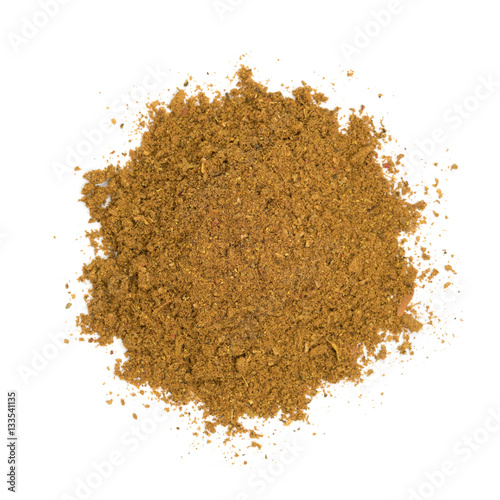 Bio organic ras el hanout pile isolated on white background, top view