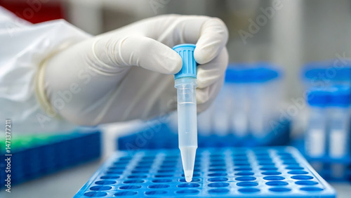 Biolabs Concept ,sterile glove is carefully picking up DNA sample tube laboratory setting, showcasing precision
