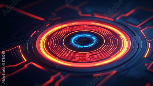 Biometric security and iris privacy, A vibrant, futuristic design featuring concentric circles in red and blue, resembling a digital interface or tech-inspired artwork.