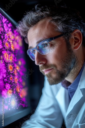 Biotech researcher using advanced computer software to design synthetic biological materials