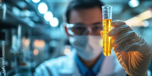biotechnology research in action, close-up of a lab technician holding a test tube containing a precision sample, focused on advanced scientific study and laboratory innovation