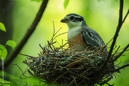 Bird constructs its nest with twigs in a lush green forest, showcasing nature's intricate craftsmanship and vibrant surroundings