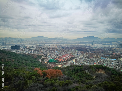 Bird eye view of part of capital city of Seoul from high ground at namsan Seoul South Korea. Visible noise and soft focus due to foggy and cloudy morning. Cloudy blue sky at background.