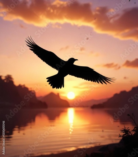 Bird in flight with silhouetted form against sunset, aerial, sun, flying