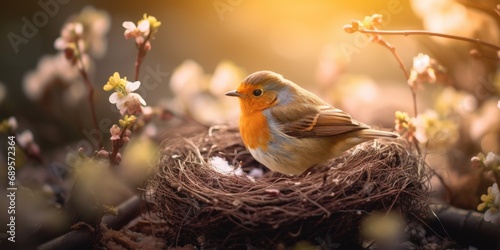 Bird perched in nest on a branch, surrounded by springtime flowers, capturing the beauty of nature.