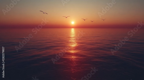 Birds fly over tranquil ocean sunset
