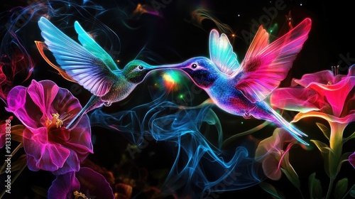 Birds hovering over flowers, neon lights plexus, glowing lasers, abstract motion, black background, stunning wallpaper