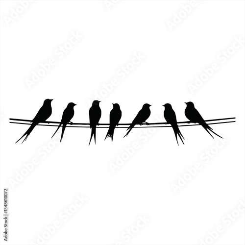 Birds sitting wire. Silhouette flock black bird on telephone electricity cable, swarm feathers swallow or swift pair sparrow love fly animal vector illustration. Silhouette bird wildlife on wire