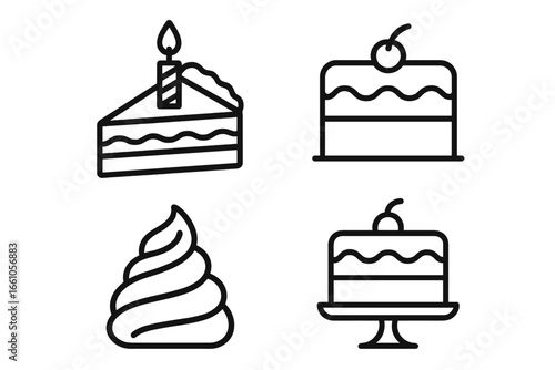 Birthday cake vector icon set. Outline graphic symbols for celebration design. Includes cake slice with candle, whole cake on a stand, cherry topper, and sweet icing swirl.
