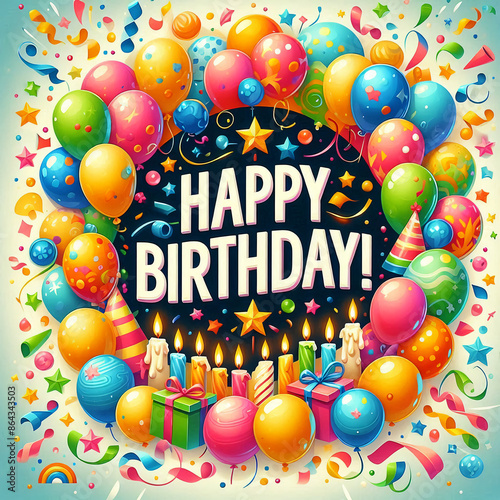 Birthday logo with confetti and balloons