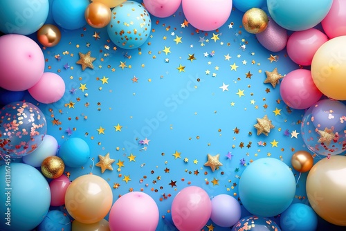Birthday party background on blue, Top view, Frame made of colorful serpentine, balloons, candles and confetti,