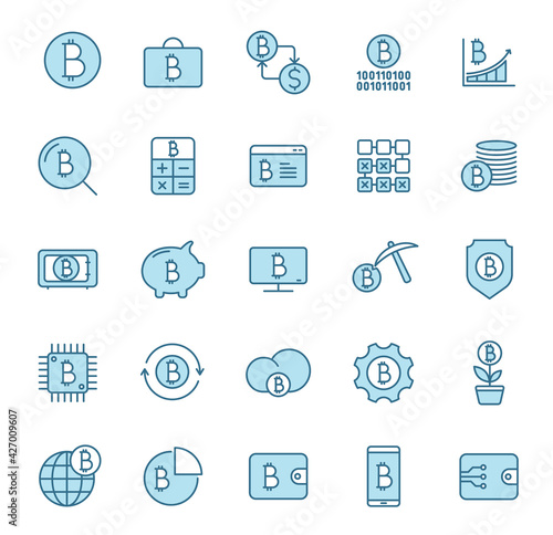bitcoin line vector icons in two colors isolated on white background. bitcoin cryptocurrency blue icon set for web design, ui, mobile apps and print