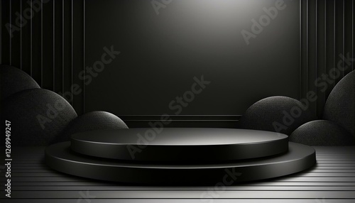 black 3d stage banner on modern podium empty background mockup with abstract light dark product space display stand or luxury presentation pedestal scene studio and advertising backdrop sale platform