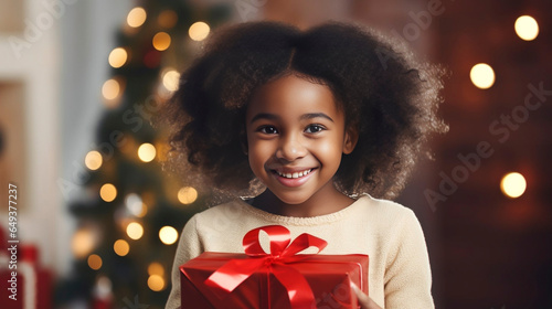 Black african american child with a Christmas present during Christmas time. Little child recieving a Christmas present. Happy child smiling with a present. Christmas tree with lights in the backgroun