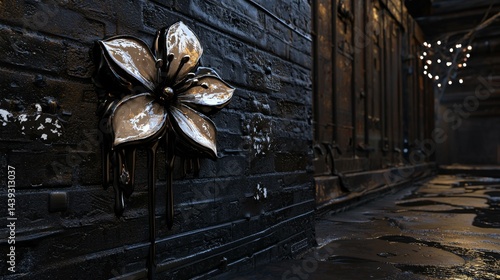 Black and Gold Flower Art on Urban Wall with Reflections and Ambient Lighting in an Industrial Environment