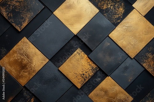 Black and gold textured square pattern, a modern geometric design element. Perfect for backgrounds, textures, and stylish designs with a luxurious feel.