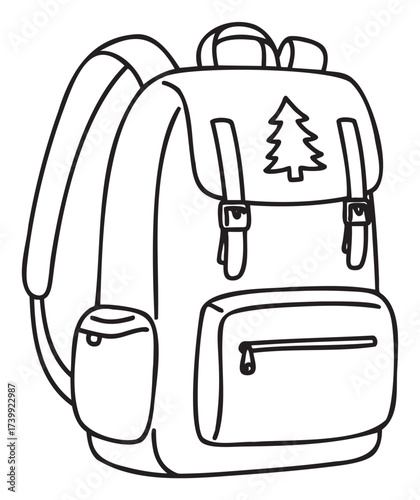 Black and outline drawing of a backpack with a tree design, featuring adjustable straps and multiple pockets.