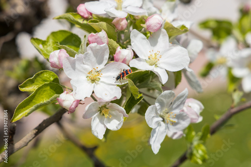 Black and red beetle in apple blossoms, close-up