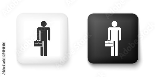 Black and white Businessman man with briefcase icon isolated on white background. Square button. Vector.