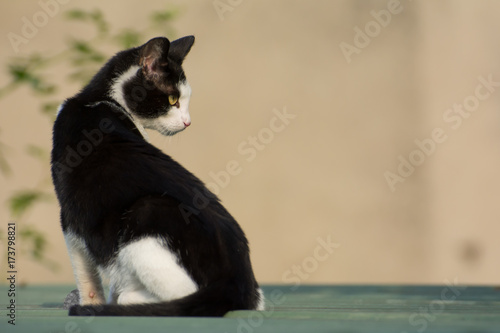 Black and white cat sitting on a garage roof, looking to the right - place for text