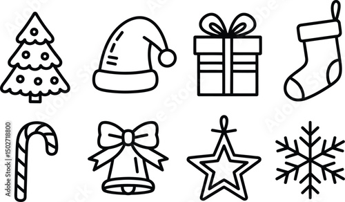 Black and white christmas icons collection santa hat tree gift stocking bell
