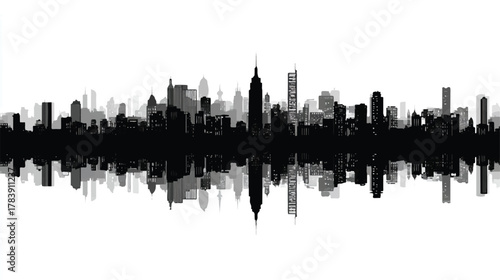 Black and White City Skyline Silhouette with Water Reflection Graphic