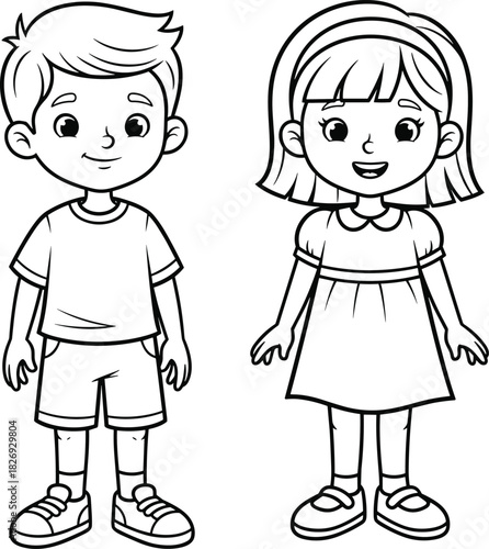 Black and white coloring page of smiling boy and girl standing, kids illustration, children wearing casual clothes, happy cartoon characters.
