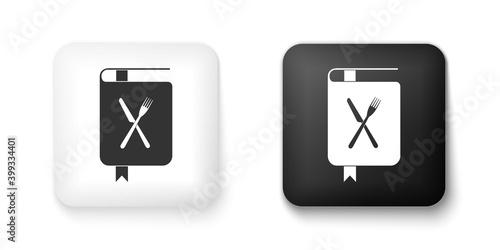 Black and white Cookbook icon isolated on white background. Cooking book icon. Recipe book. Fork and knife icons. Cutlery symbol. Restaurant symbol. Square button. Vector.