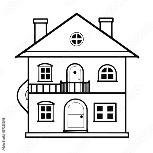 Black and white drawing of a two-story house with multiple windows and a balcony. Simple outline of a home with various architectural details.